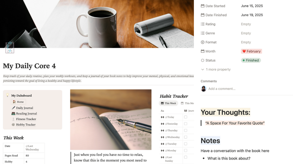 With this database, you will be able to track simple habits that help to improve the balance of your life by focusing on yourself. See a walkthrough of the system below: